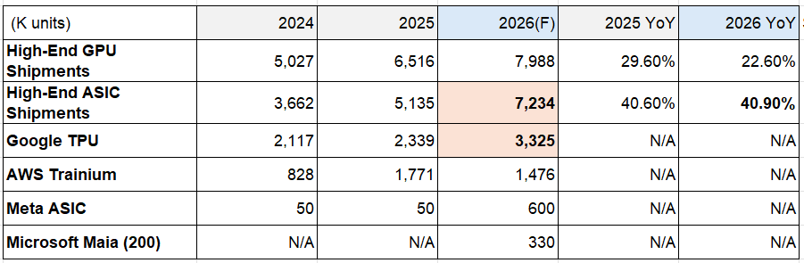 High-end ASIC chip shipments are projected to experience significant year-over-year (YoY) growth, exceeding 40% in both 2025 and 2026.