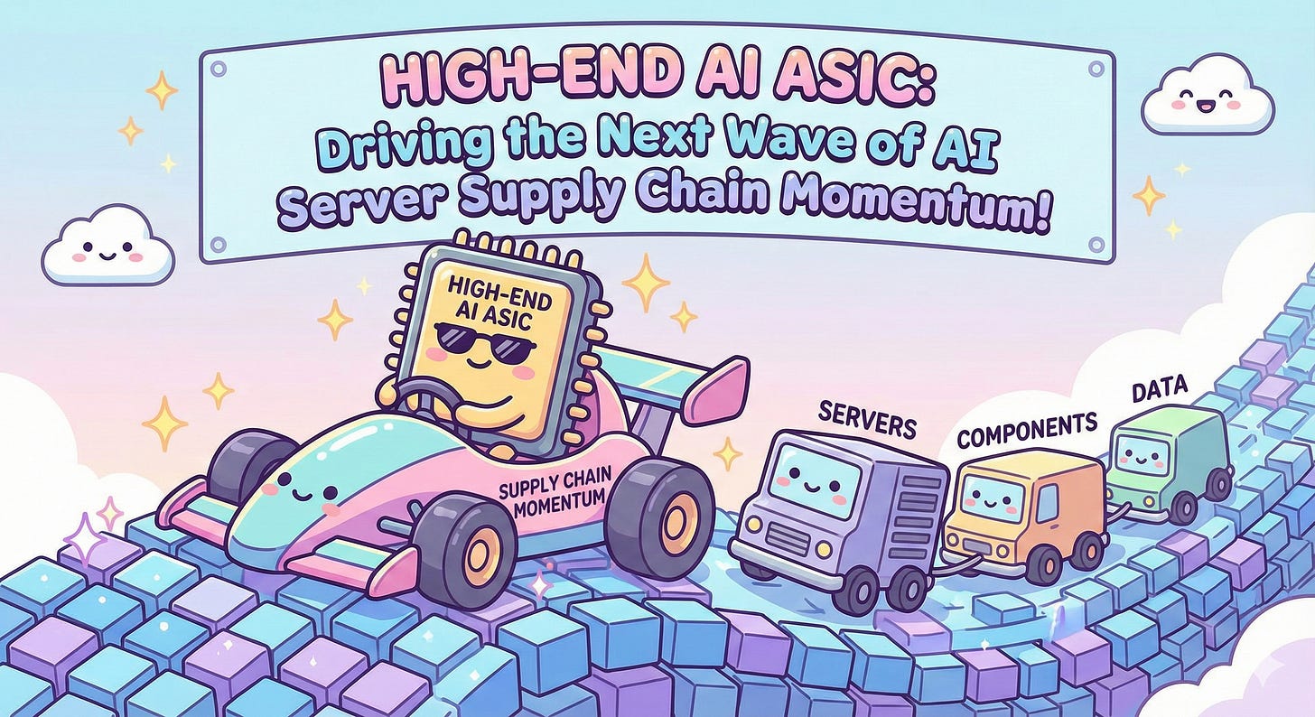 The trajectory for high-end AI ASIC chips suggests they will become the next critical growth engine for the AI server supply chain, surpassing high-end GPU growth in terms of percentage increase from 2025 through 2026.