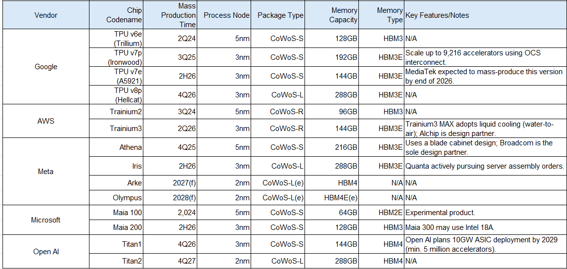 • Maia 200: Expected to enter mass production in 2H26, with an estimated full-year shipment of 330,000 units. It uses the 3nm process and 128GB HBM3 memory.