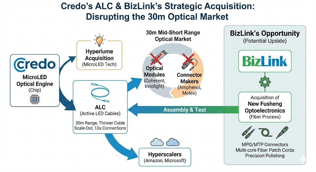 The ALC play by Credo is really interesting since it opens up a completely new market segment for the 30m range using MicroLED instead of traditional optical modules. The bit about BizLink acquiring New Fusheng for fiber optic assembly makes perfect sense because that precision polishing capability is super specialized. On the AWS Trainium 4 side, Nvidia basically locked in the XPU scale-up market with NVSwitch which squeezes out Broadcom and other third-party switch vendors pretty hard.