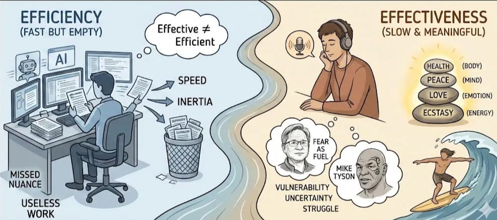 This week, while using AI tools, I had a major realization: being efficient is different from being effective. Both are important, but from the perspective of achieving goals, the primary focus should be on efficacy. Getting things done quickly isn’t necessarily useful; sometimes it’s just fast.