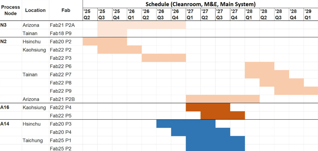 A14: Risk production is expected in 2027, with official mass production in 2028. Anticipated locations are Taichung Fab 25 and Hsinchu Fab 20.